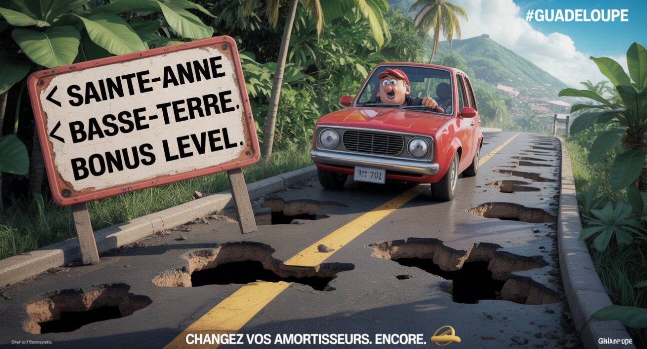 On slalome entre les cratères, on prie pour son train avant, et on gagne un badge de bravoure à chaque trajet Sainte-Anne → Basse-Terre.